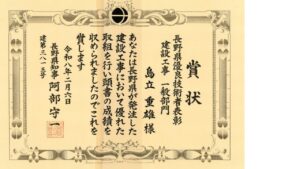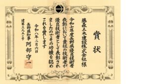 ⻑野県の建設⼯事において、その成績や取組が特に優れている技術者を表彰する優良技術者表彰を弊社の「令和4年度 防災・安全交付金 交通安全工事」にて受賞致しましたのでお知らせ致します。